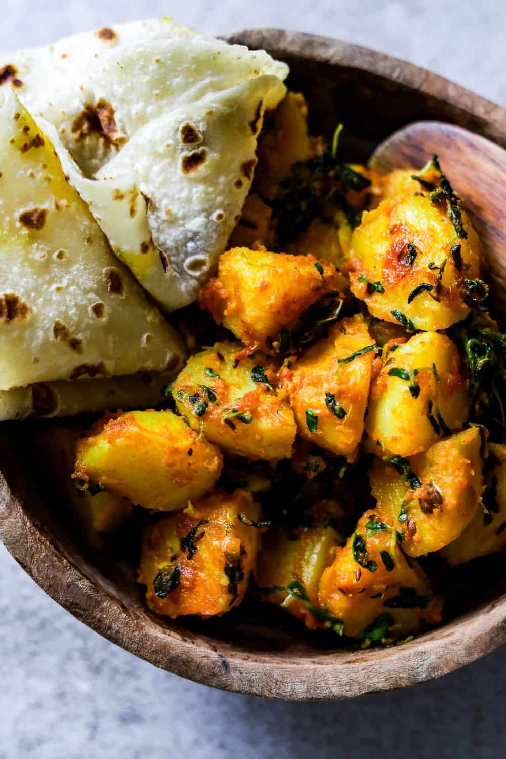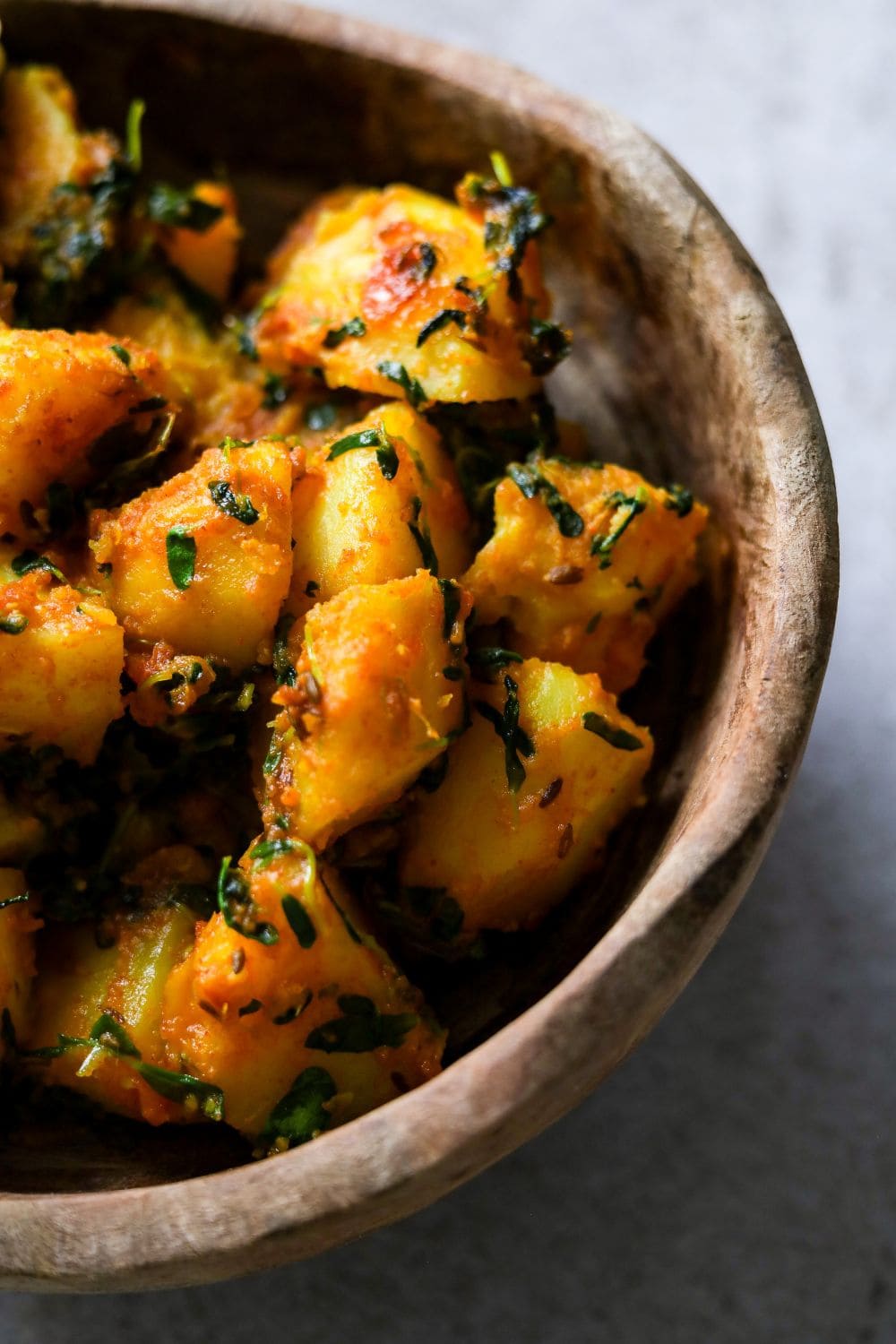 This Aloo Methi is more a stir-fried potato dish. You boil the potatoes, before cooking the dish, so that it fries in the oil.
