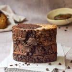 Grease and line a loaf pan. Pour one third of the plain batter in one corner of the pan and one third of the chocolate next to it. Repeat two more times. Use a skewer and swirl it through the batter. Sprinkle the chocolate chips on top