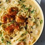 Divide pasta into pasta bowls and add the prawn sauce on top. Garnish with parsley and add some parmesan if you prefer. You can also mix the sauce and pasta together which is recommended if you want all that saucy goodness.
