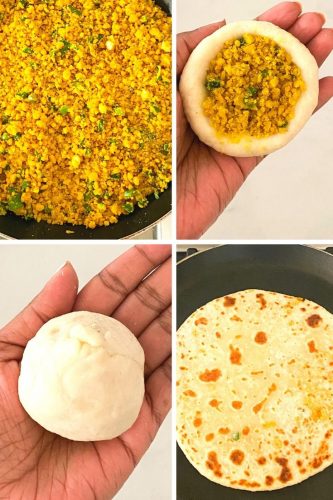 Divide the dough into 12 balls and fill them with about 2 tbsp of dal. Bring the edges together to form a ball.