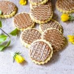 I then made lines with the white chocolate, also in a disposable piping bag with a tiny hole, on top of the milk chocolate. I then took a toothpick and ran it from top to bottom to achieve the look on these cookies. The piping bag with a little hole works best for decorating with chocolate. You can choose to do whatever design you wish
