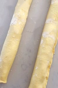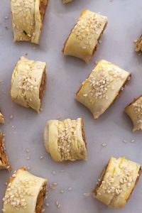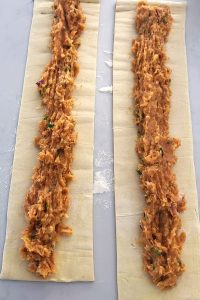 Unroll the pastry and cut into two halves. Divide the mixture between the two pastry pieces, spreading it in the middle, lengthwise, and just pat mixture with your hands to make a cylinder shape.