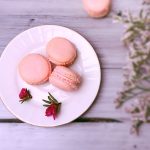 In a clean bowl, whisk the egg whites with the salt until soft peaks are formed. Add castor sugar a little at a time and whisk until the whites are thick and glossy, you can add your rose essence at this stage. You can also add a few drops of rose syrup or some gel colouring to get pink macarons